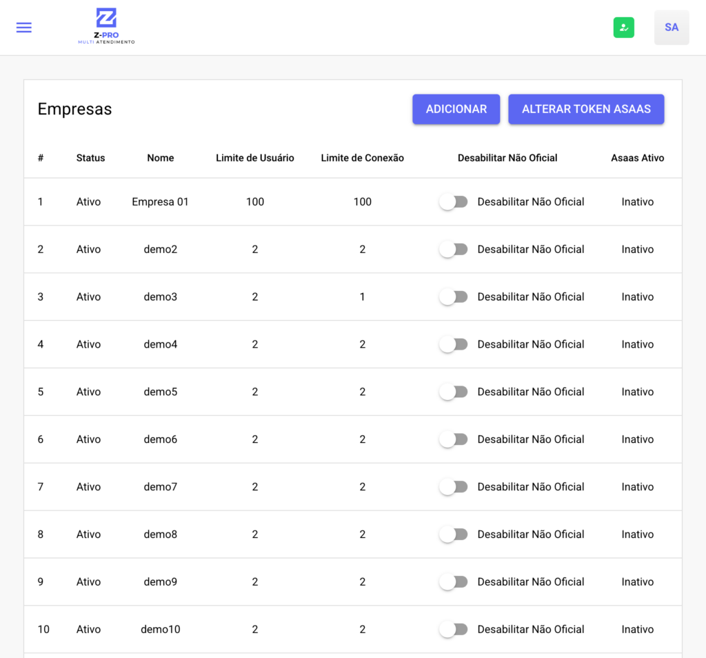 Como vendemos no modelo auto-hospedado, existem algumas limitações para o teste gratuito. Mas para o módulo admin é possível liberar um acesso de demonstração no nosso servidor interno. Nos chame no WhatsApp para solicitar a liberação.